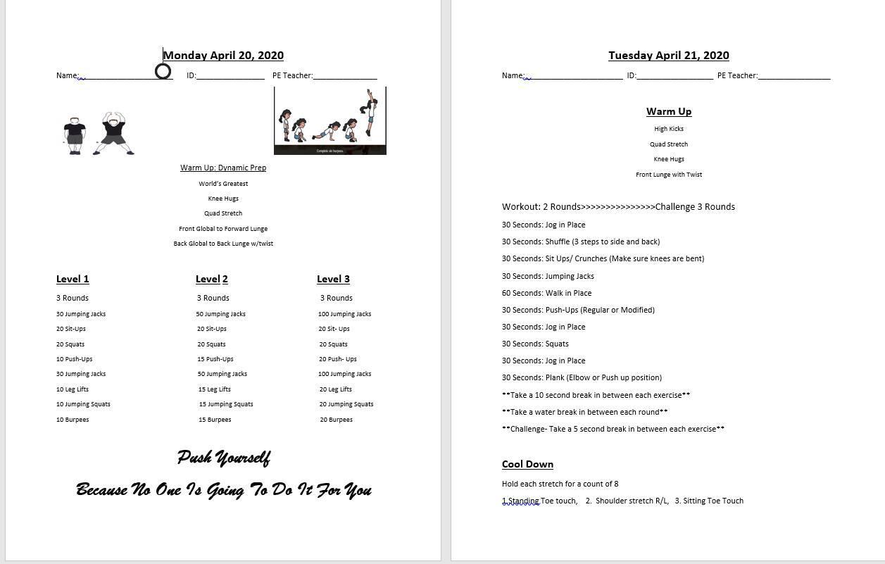 "10minuteexercise" attachment is a 10 minute workout video focusing on cardio, core (abs) and lower body. Remember, I cannot download all of these videos on this site because of errors on longer videos. For a larger collection of games, workouts, videos, sign up for my google classroom!