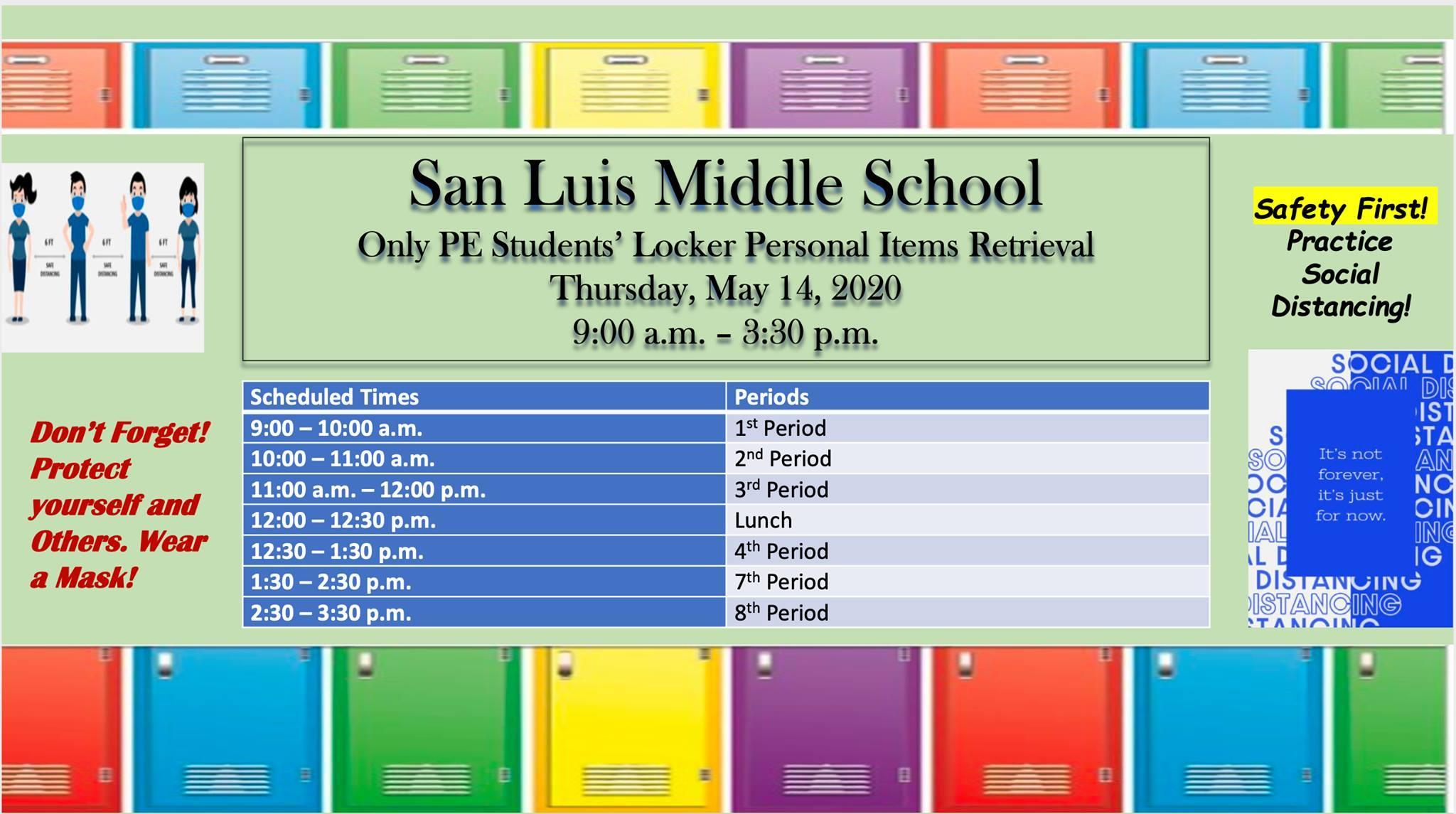 IMPORTANT MESSAGE! Thursday May 14th is the day you can come to the gym to get your belongings from your locker. There is a schedule, and important reminders. i posted the school's photo of this down in the attachments. Please be sure to follow the guidelines if you plan on coming to get your stuff.